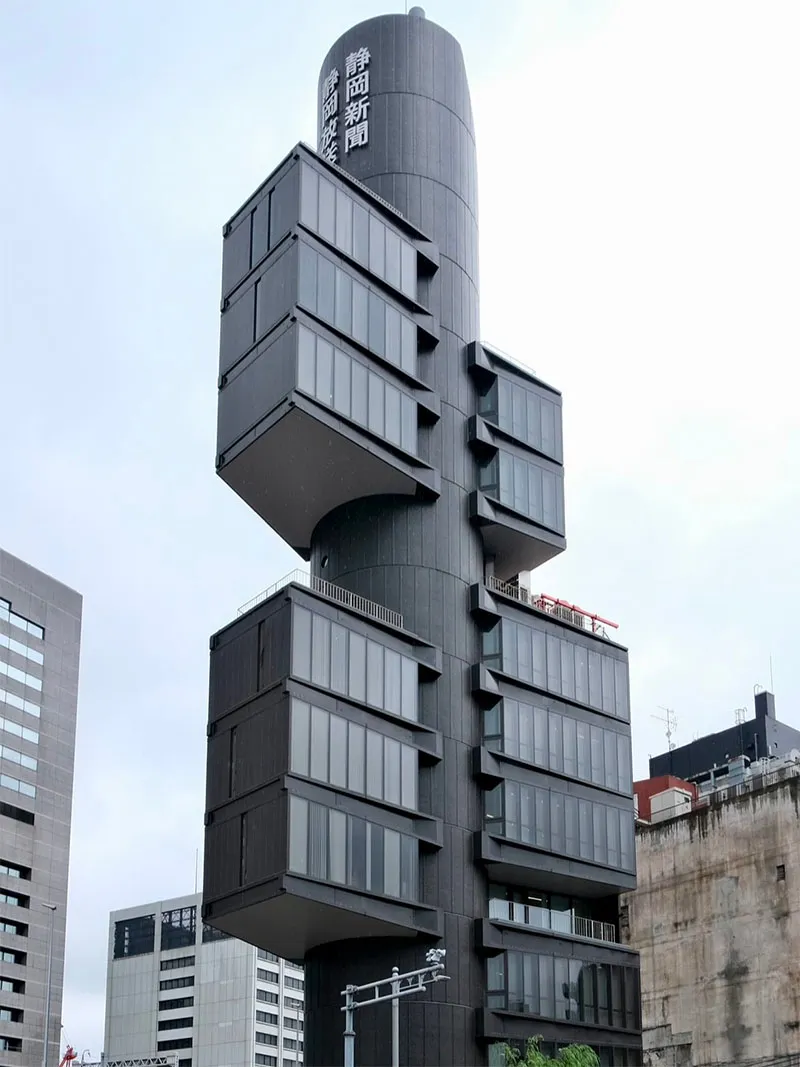 E l'iconica torre del Shizuoka Press and Broadcasting Center (1967), la prima realizzazione spaziale delle idee metaboliste di Tange sulla crescita di ispirazione organica. Nonostante le sue dimensioni relativamente ridotte, lo Shizuoka Center è molto più significativo di quanto si creda: una struttura verticale, costituita da un nucleo infrastrutturale cilindrico contenente scale, ascensori, cucina e servizi igienici a ogni piano che funge da pozzo di accesso alle unità modulari degli uffici, scatole a sbalzo in vetro e acciaio di 3,5 metri.