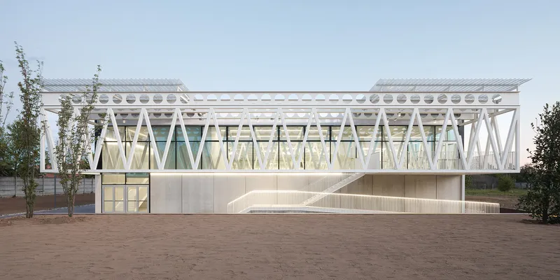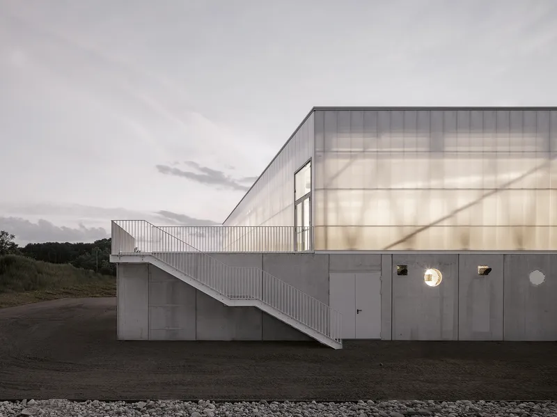 Il sistema di travi metalliche scorrevoli definisce uno spazio protetto e di transizione verso il bar al primo piano, accessibile tramite una rampa esterna, mentre la terrazza offre una vista sul bosco di betulle che separa l'edificio dal parcheggio. I due livelli intessono un rapporto simbolico con la terra e con il cielo, tradotti in una base in calcestruzzo grezzo e un volume superiore in vetro e policarbonato. Quest'ultimo, riflettendo i colori del cielo, varia al variare della luce, mentre il contrasto materico e formale genera una tensione visiva che dà risalto alla semplicità delle geometrie.