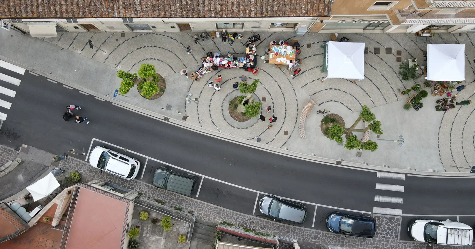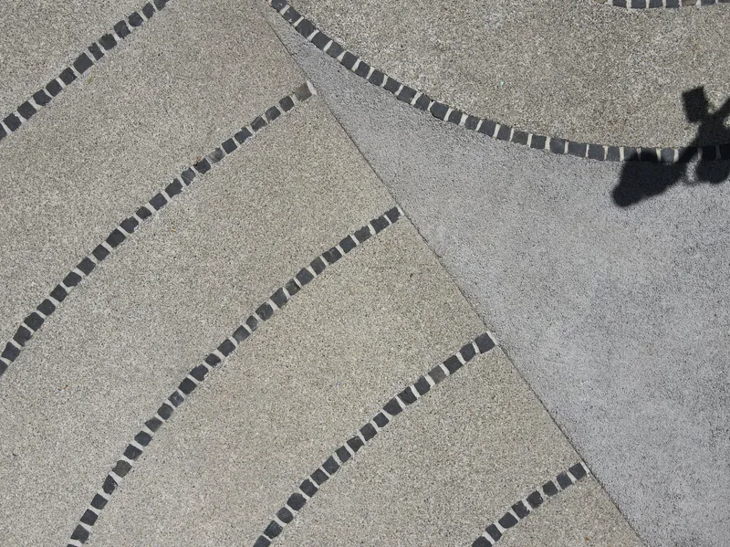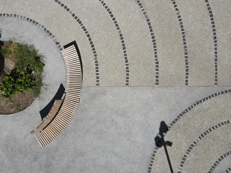 La pavimentazione continua, basata su un disegno geometrico e rigoroso, è realizzata combinando cemento architettonico drenante e inserti in porfido, dando vita a uno spazio riconoscibile, contemporaneo e allo stesso tempo radicato nel contesto.