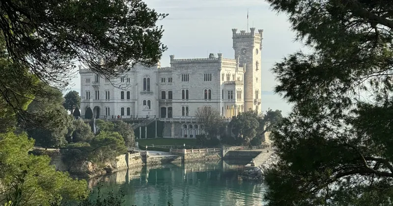A otto chilometri dal centro, la strada costiera curva tra mare e roccia e il Castello di Miramare appare all'improvviso, bianco sull'azzurro del Golfo. Progettato dall'architetto austriaco Carl Junker tra il 1856 e il 1860 per l'arciduca Ferdinando Massimiliano d'Asburgo, nasce come residenza privata ma anche come segno politico, pensato per affermare il potere imperiale sull'Adriatico.