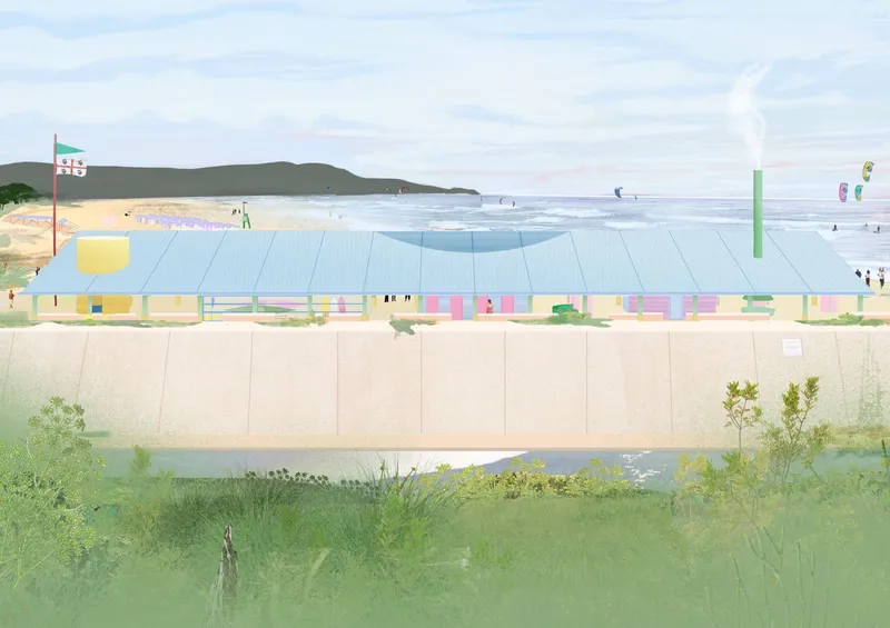La nuova piattaforma ospiterebbe, così, le principali funzioni e servizi balneari, raccolti sotto una copertura leggera in acciaio e vetro in armonia con i materiali tradizionali, come la terra cruda pisé. Qui troverebbero spazio un infopoint circolare dedicato agli sport acquatici e al turismo sostenibile, depositi per attrezzature sportive, il blocco servizi con cabine e docce, e un bar-ristorante pensato per funzionare tutto l'anno grazie a pareti mobili che garantiscono protezione dalle intemperie.