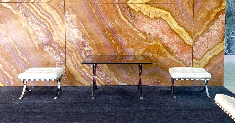 Le lastre d'onice, con venature quasi paesaggistiche, svolgono più ruoli: membrana, fondale, riferimento visivo. Ne deriva un'architettura che prima di definire un uso produce una condizione: un luogo che attiva attenzione e ascolto.