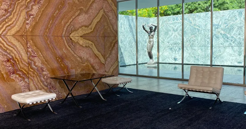 Pur nato per accogliere la delegazione tedesca, non espone nulla se non sé stesso. Nessun ornamento, nessun simbolo: Mies van der Rohe e Lilly Reich scelgono la sottrazione come metodo.