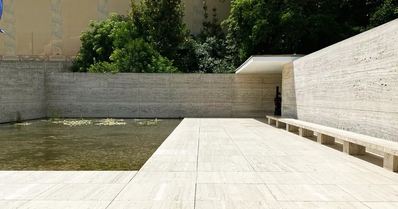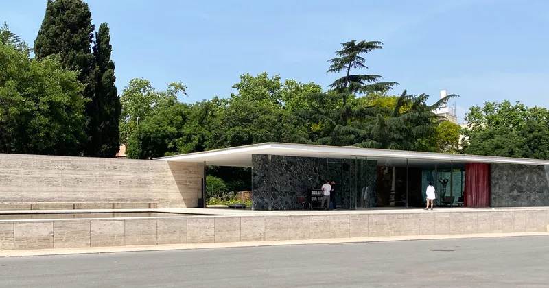 Lo si intravede all'ultimo momento, tra gli alberi: una linea orizzontale che non si impone, ma si lascia scoprire. Il Padiglione Tedesco, progettato da Ludwig Mies van der Rohe e Lilly Reich per l'Esposizione Internazionale del 1929, si solleva leggermente dal suolo: quanto basta a segnare una soglia.