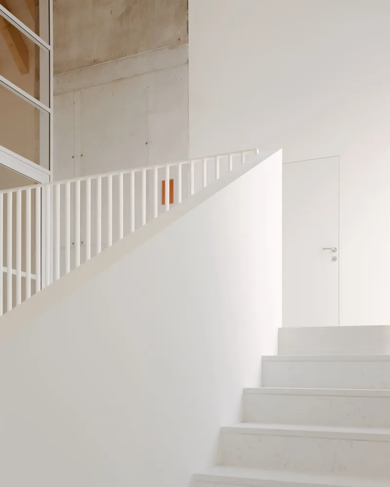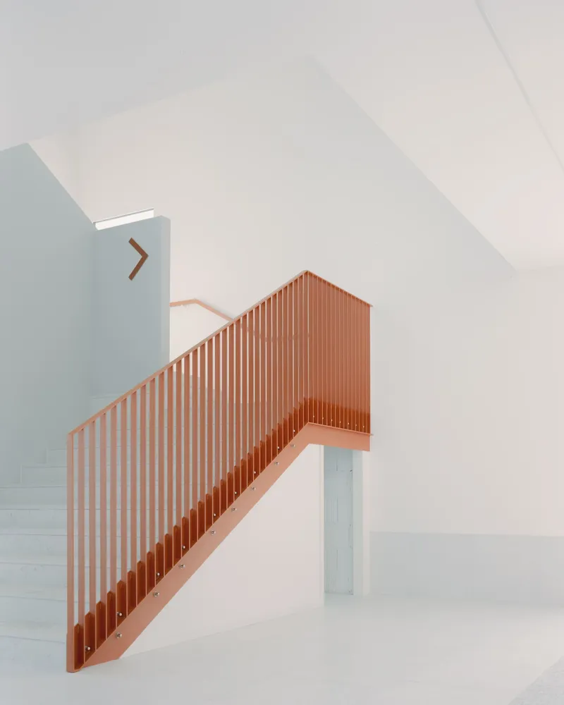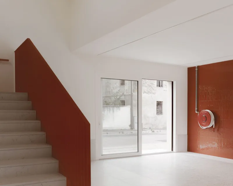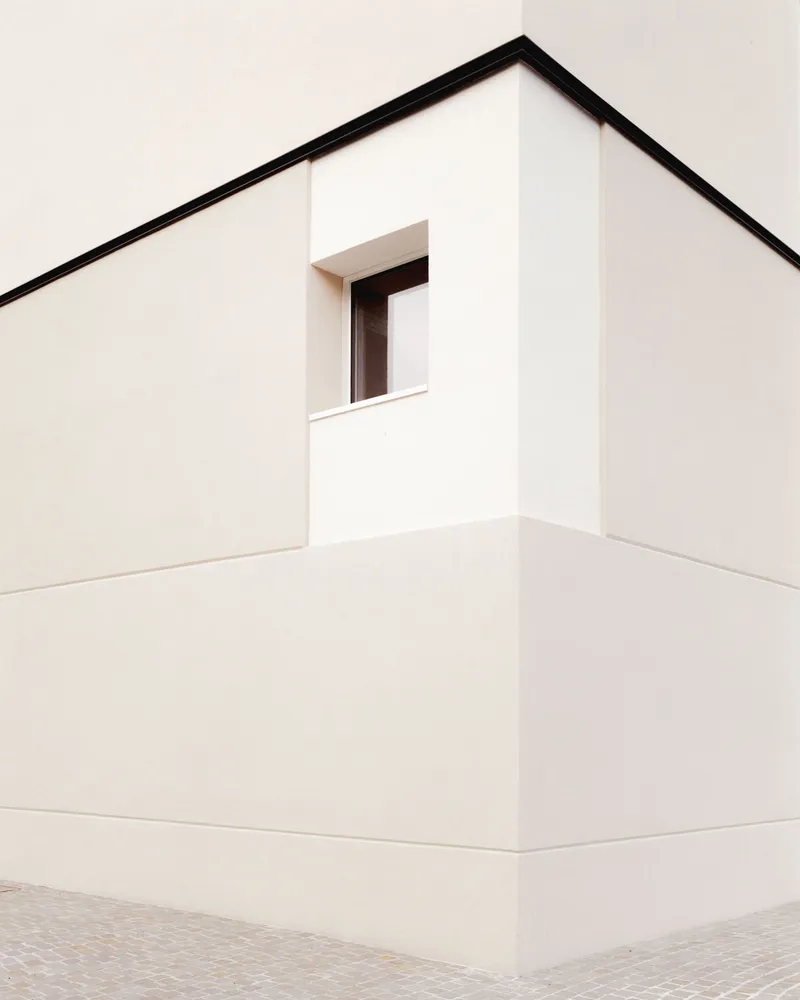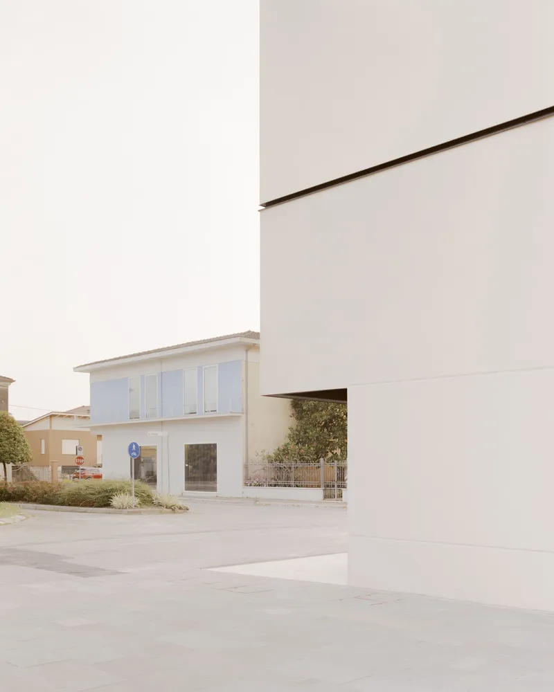 L'edificio più basso, invece, si attesta sul fianco opposto rispetto alla strada e, con il suo arretramento, definisce lo spazio pubblico, che viene ulteriormente precisato dalla presenza del piccolo giardino, mentre le facciate rielaborano i temi classici dei fronti urbani, e subiscono nel loro sviluppo un progressivo processo di rarefazione.