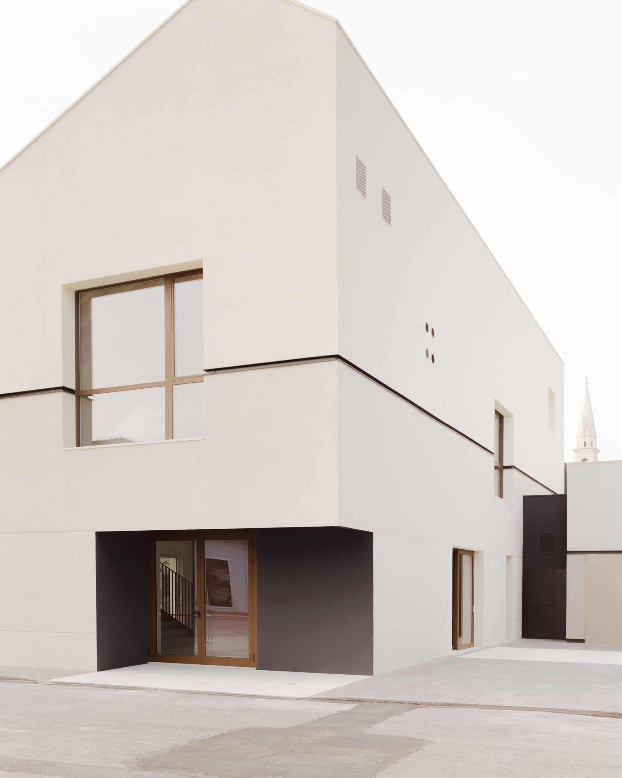 La forma ad L del complesso è composta da un edificio di un solo piano, adibito a centro di aggregazione per la comunità con caffè, panetteria, alimentari e un corpo di fabbrica a due piani, che ospita il centro polifunzionale per la famiglia.