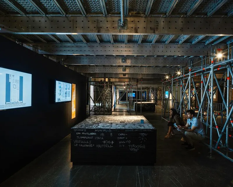 Ma è nella Tesa II che l'allestimento muove lo spazio, creando un sopra e un sotto, un dentro e un fuori al servizio del Pontile della ricerca che ospita le esplorazioni didattiche con le tesi di laurea, i dottorati, i laboratorio didattici, un inedito studio sul patrimonio culturale sommerso, i progetti partecipativi, le sperimentazioni AI e le iniziative di rigenerazione promosse dagli Enti Pubblici. Le incursioni d'arte e i contributi artistici sono diffusi in entrambe le Tese e sono sia punti di luce nella penombra del mare/padiglione sia riflessioni sullo spazio costiero come spazio sensibile e in trasformazione.