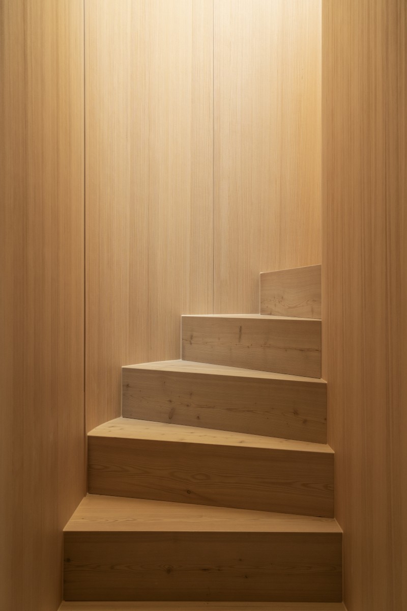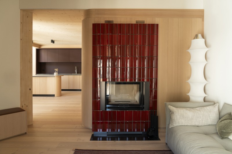 Come lo studio di Zurigo ha fatto per l'architettura, anche Park guarda al passato per gli interni che traggono ispirazione dalle architetture alpine del Novecento - Carlo Mollino ed Edoardo Gellner su tutti - reinterpretate attraverso materiali, cromie e geometrie che dialogano con il paesaggio circostante. Ne nascono spazi essenziali, morbidi, mai rigidi, dove il legno smussa gli angoli e accompagna fluidamente il passaggio tra le stanze.
