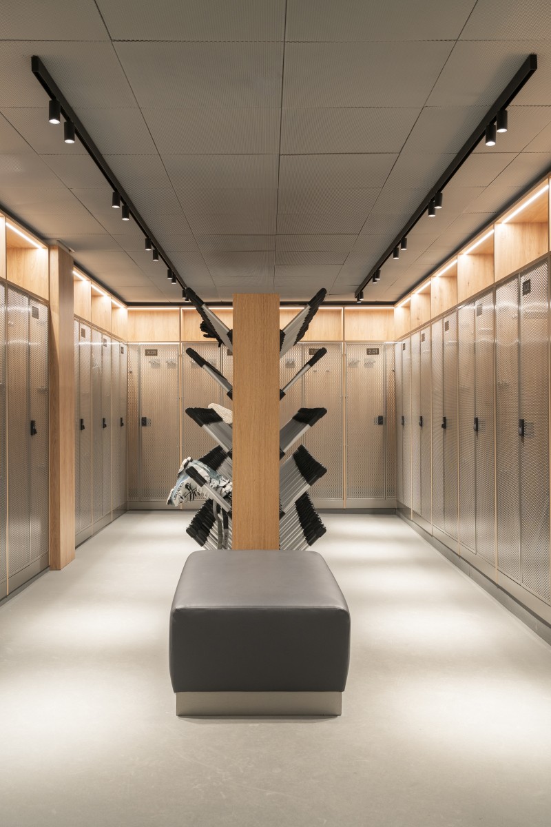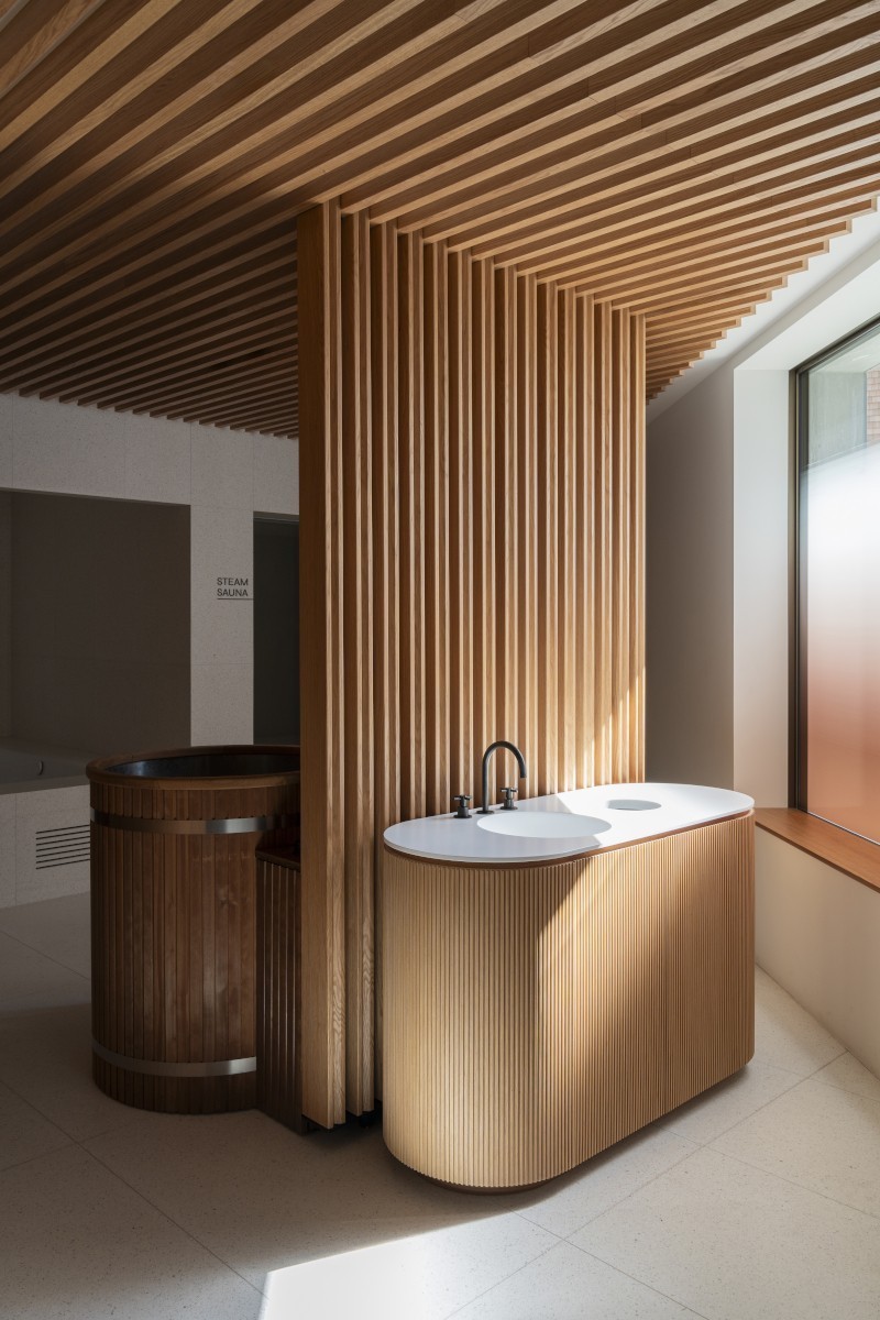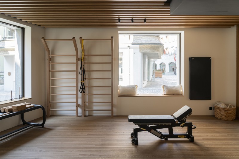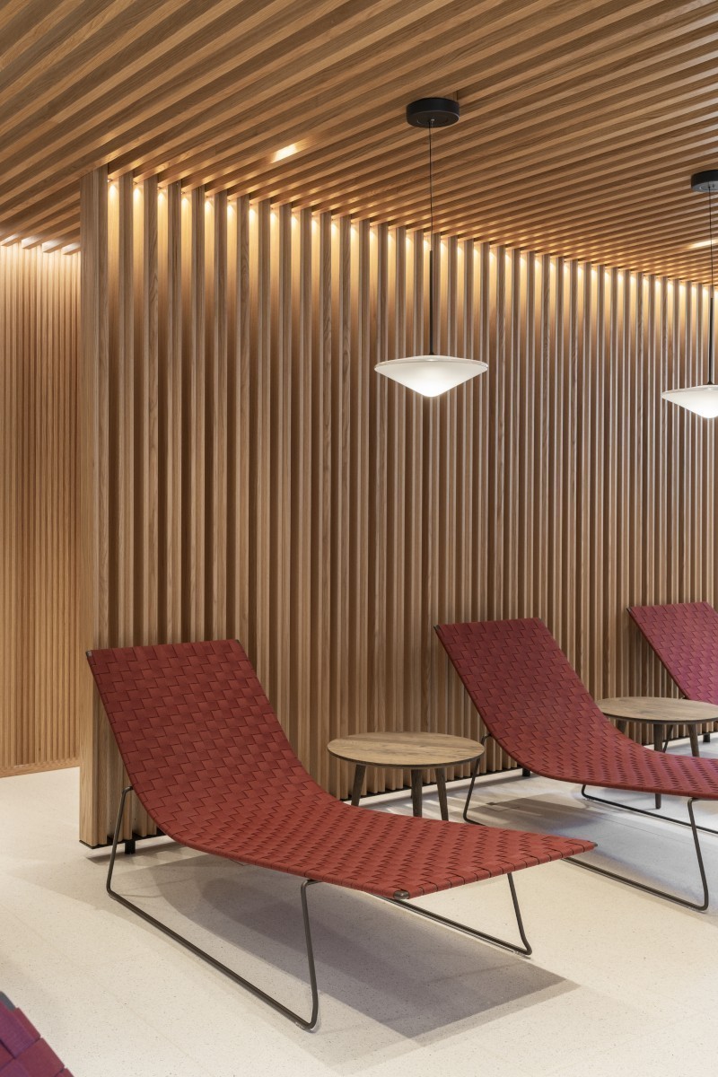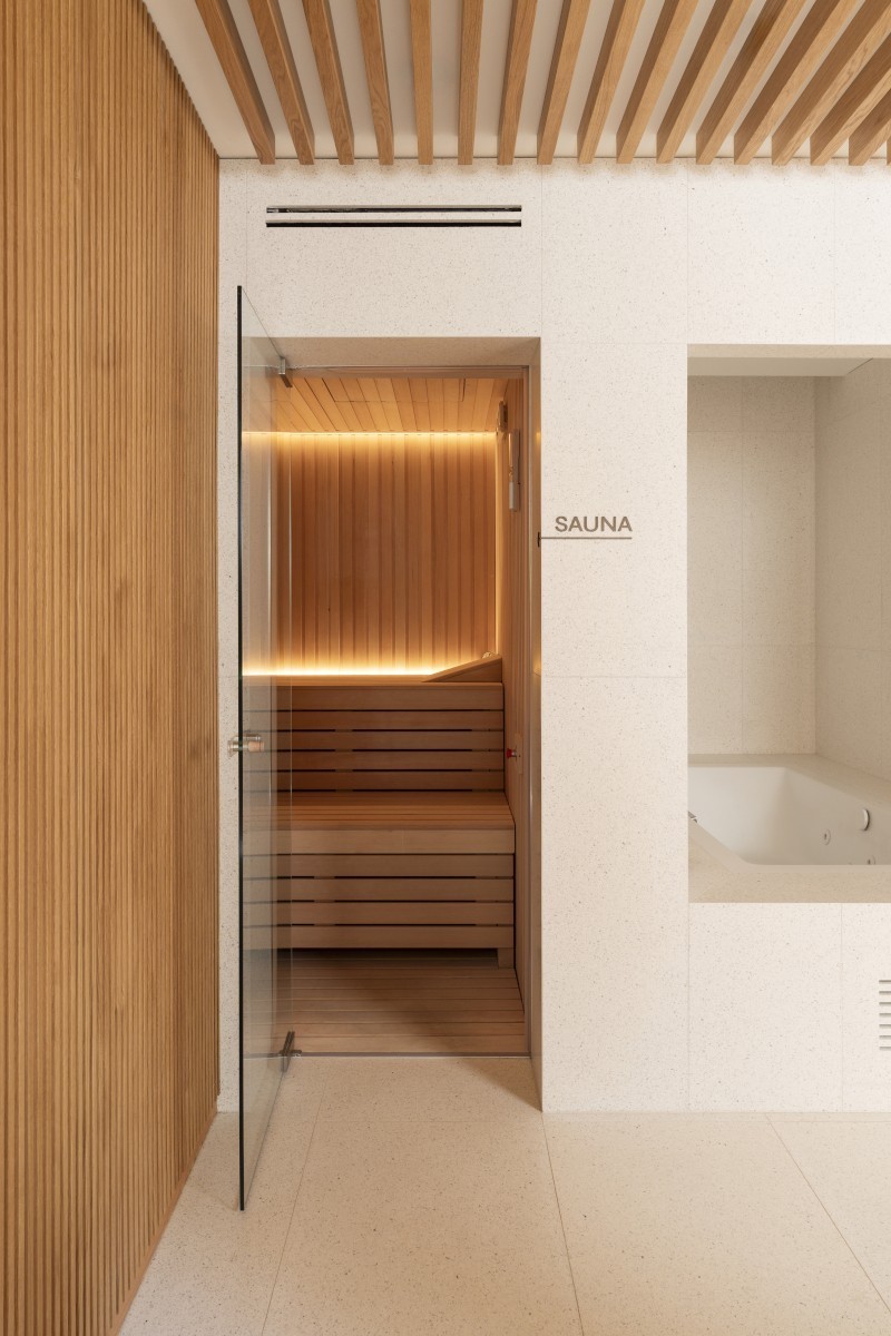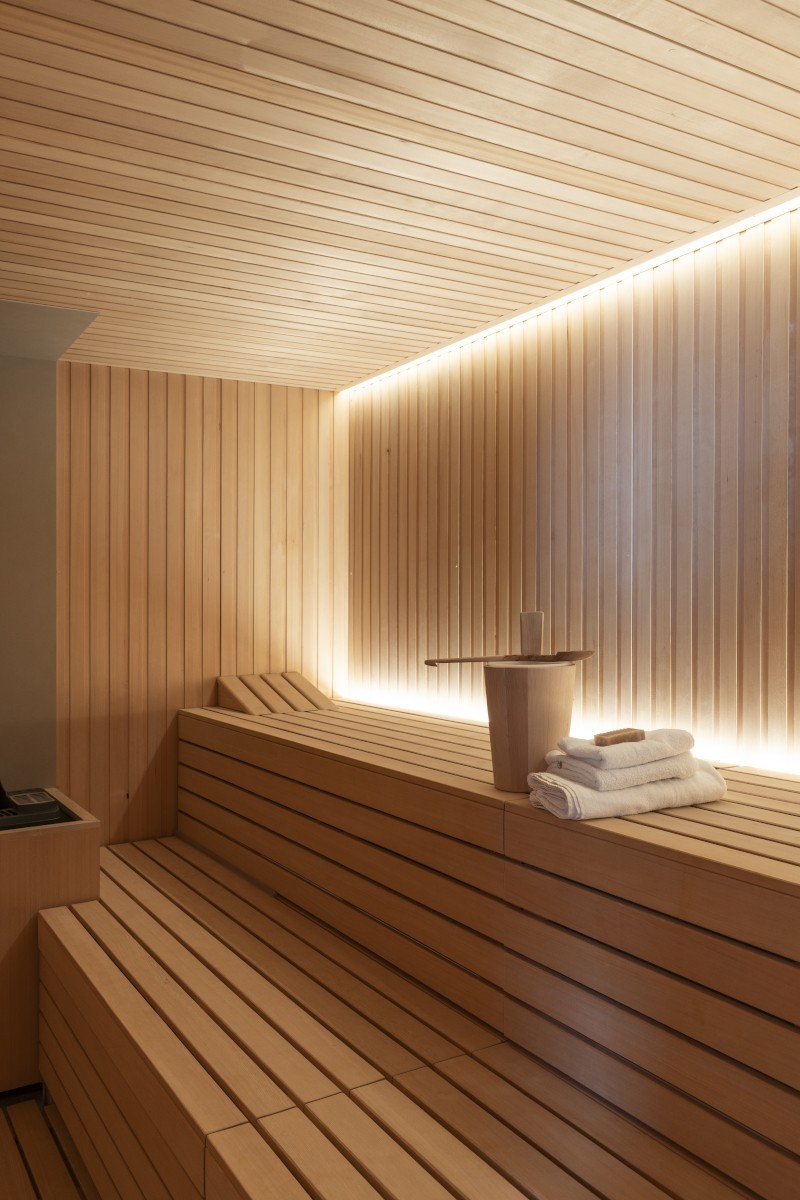 Le aree comuni - luminose e affacciate sul borgo - sono pensate per il benessere e la socialità: spa con sauna e bagno turco, area fitness, sala yoga, ski e bike room. Spazi in cui il linguaggio tecnico dei materiali si intreccia con il calore del legno, mantenendo quell'equilibrio unico che caratterizza tutto il progetto.