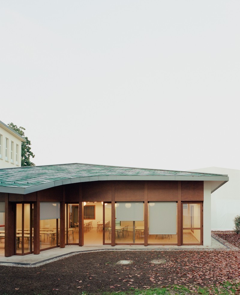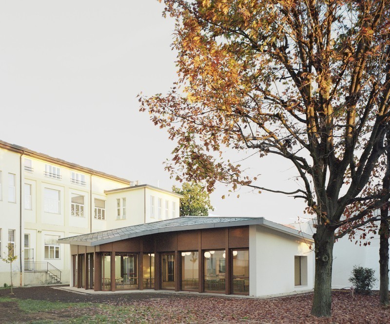 Il padiglione nel verde, realizzato in sostituzione del vecchio refettorio, è formato da un volume compatto e articolato, ma allo stesso tempo aperto e permeabile. Il grande refettorio è concepito come un ambiente unitario che si apre sul giardino per mezzo di una grande vetrata. Al suo fianco un corpo più basso che ospita la distribuzione dei pasti, i locali di servizio, gli spogliatoi e i servizi igienici.
