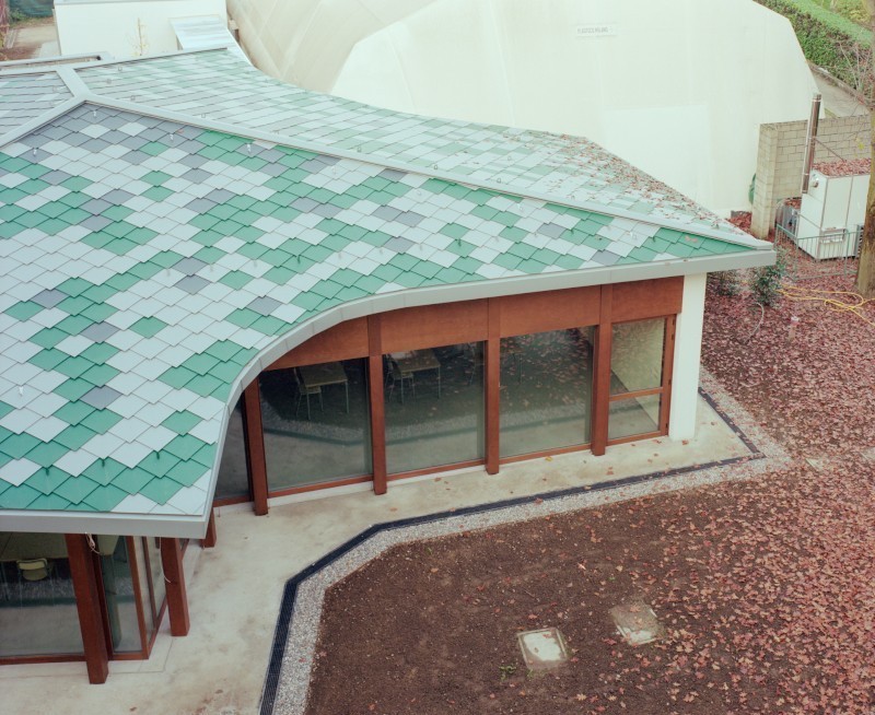 Il tetto - con la sua geometria trilobata - è rivestito con scaglie di alluminio preverniciato, restituendo una texture cromatica che aggiunge vibrazioni di luce e colore al giardino stesso. Gli oscuranti esterni, in tessuto, completano la ritmica della facciata, rafforzando la tensione dinamica del volume.