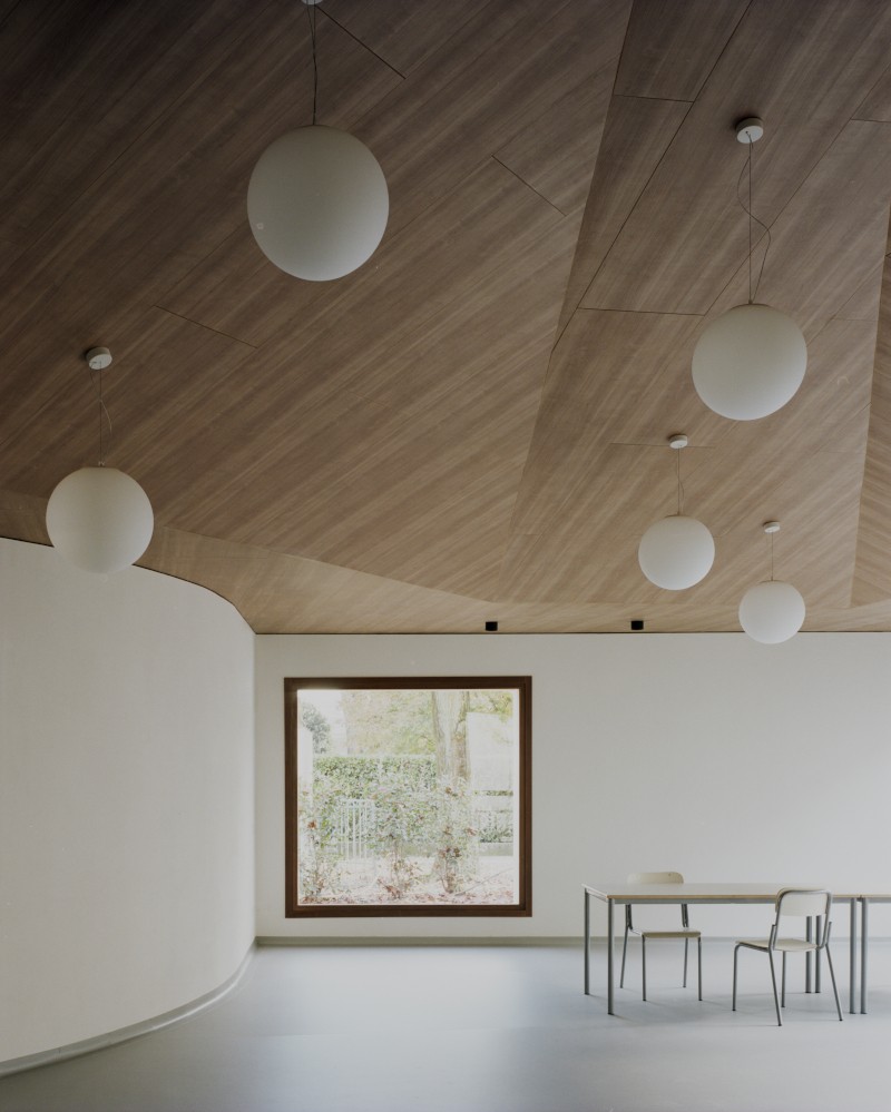 Il progetto ridefinisce anche gli spazi aperti: «Il giardino - spiegano i progettisti - viene ampliato e potenziato: le superfici asfaltate sono sostituite da nuove aree verdi, integrate da alberature e arbusti che arricchiscono l'esperienza sensoriale e restituiscono un paesaggio più ampio e articolato. Il nuovo padiglione non solo si inserisce nel giardino, ma contribuisce ad articolarne le geometrie e a riqualificarlo, diventando parte integrante del suo disegno».