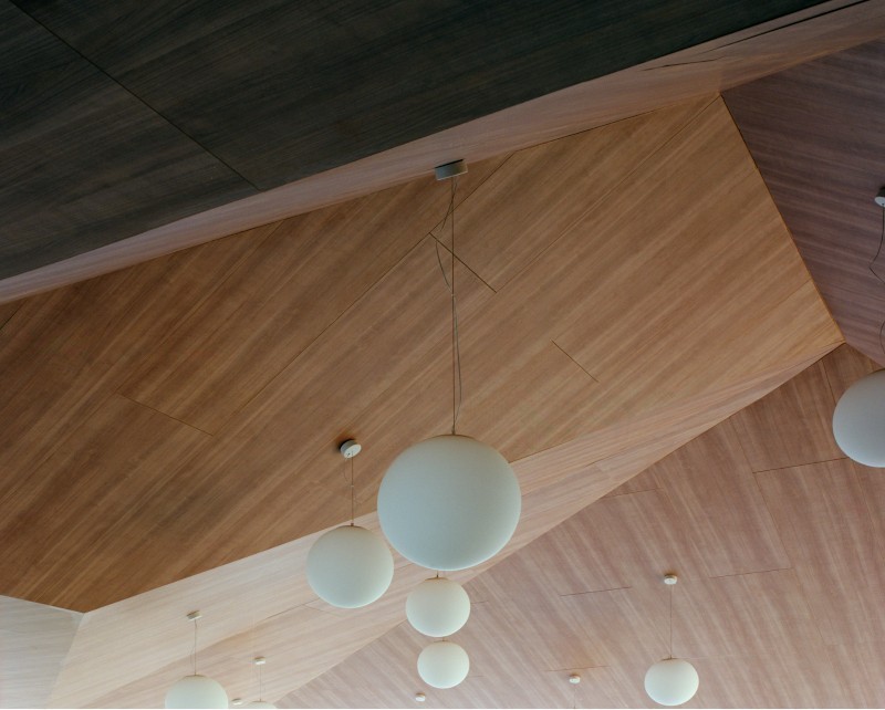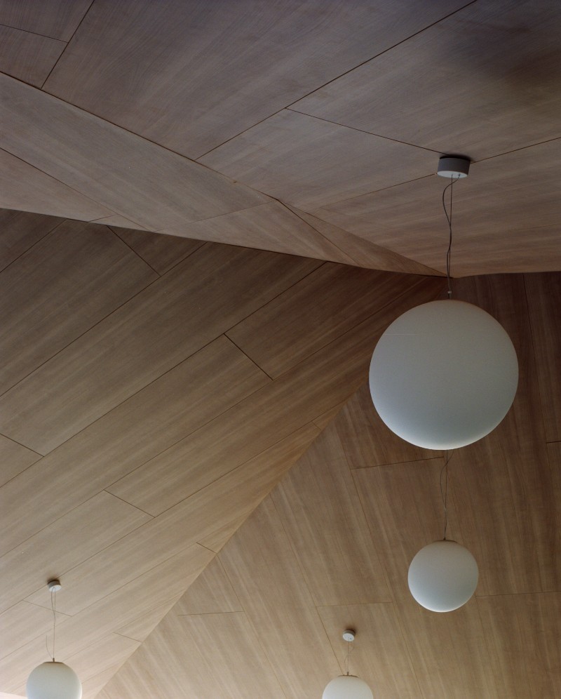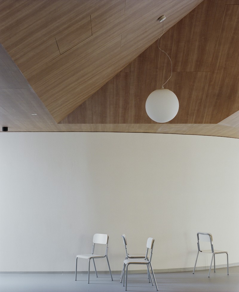 «Gli spazi interni - spiegano ancora i progettisti - amplificano la torsione dinamica del volume, definendo una sorta di cassa armonica pronta a dare voce alla ricreazione degli studenti. I pavimenti vinilici garantiscono funzionalità e continuità materica, i rivestimenti in grès definiscono i locali di servizio, i controsoffitti delle geometrie sorprendenti assicurano un'adeguata qualità acustica allo spazio del refettorio. Tutto concorre a costruire un ambiente ordinato, luminoso e sereno, in cui ogni elemento tecnico diventa parte di un insieme unitario, che lega il fruitore allo spazio che lo circonda».