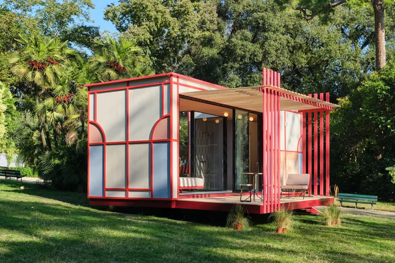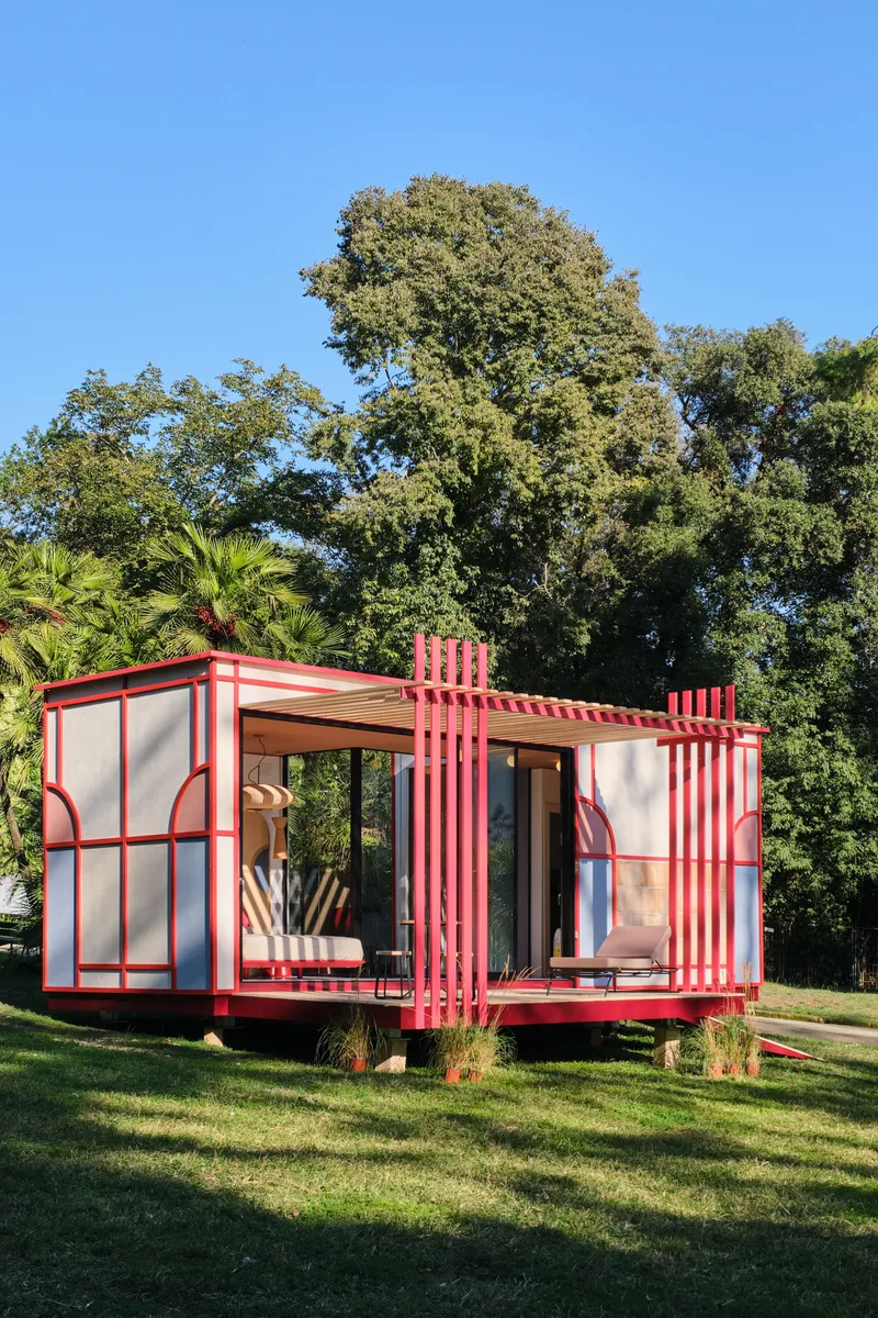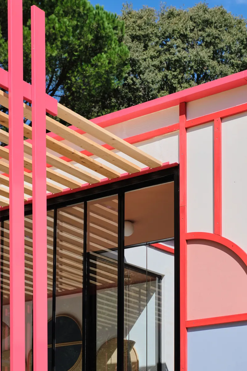 La facciata della casa viene rivestita da una trama di archi sovrapposti a geometrie più rigide, realizzata in legno, che genera un pattern visivo ispirato alle logge, alle verande e alle finestre ad arco degli edifici mediterranei, riempiendo alcuni spazi con ripartizioni di colore che dialogano con la superficie del modulo.