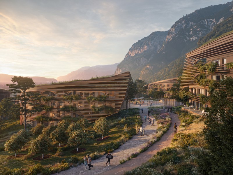 «Gli edifici variano in altezza per preservare le viste panoramiche e sono orientati strategicamente per massimizzare luce naturale e ventilazione. Per gli edifici pubblici, dove il terreno presenta variazioni di quota, gli ingressi sono distribuiti su livelli differenti, creando una configurazione spaziale coinvolgente», spiega Andrea Dal Negro.