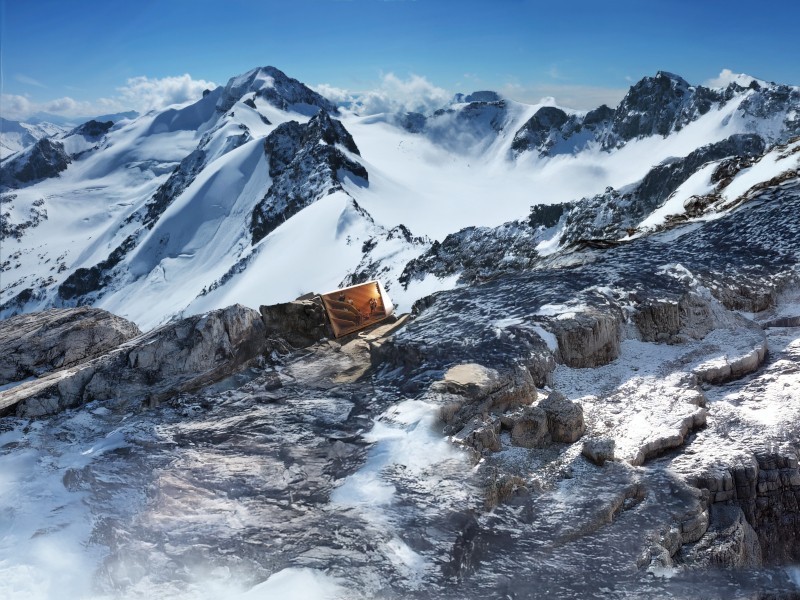 La parete vetrata del bivacco offre una vista meditativa sulle Alpi circostanti. Oltre alla sua funzione di rifugio, la struttura è anche una sorta di santuario temporaneo, un luogo di riflessione, riposo e di contatto con la natura.