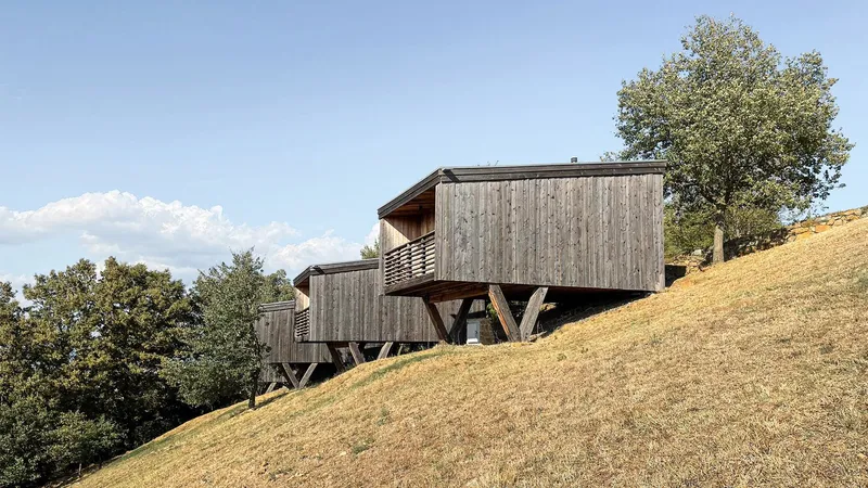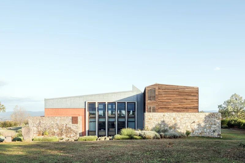 L'edificio, composto da pietra nei piani bassi e legno in quelli superiori, si orienta in relazione alla luce, con aperture ben calibrate per limitare l'impatto sul paesaggio mimetizzando l'edificio nella collina.