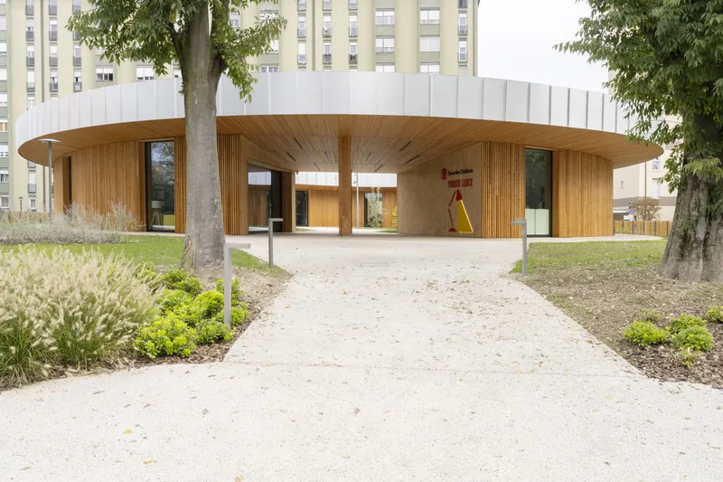 La forma a toro crea un ambiente inclusivo in cui le diverse attività convivono simultaneamente. La struttura è realizzata in legno prefabbricato: portali in GLT disposti radialmente e pareti a telaio preassemblate, con solai in CLT e tetto verde estensivo per il recupero delle acque meteoriche.