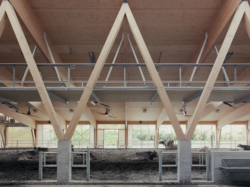 La copertura principale si compone di 52 travi lamellari inclinate sorrette da 52 pilastri tripartiti, con doppi pilastri a V che riducono la sezione e sostengono la passerella, connotando architettonicamente lo spazio. La falda sud include 6 abbaini che introducono luce solare in inverno per mantenere asciutte le lettiere. L'uso di elementi lignei sottili e pilastri e setti in calcestruzzo a vista coniuga leggerezza strutturale, durabilità e manutenzione facilitata.