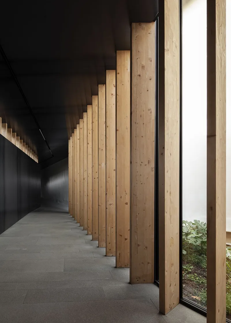 Il rivestimento esterno in larice, trattato con tecnica Yakisugi, assicura durabilità, resistenza agli agenti biologici e una finitura carbonizzata che integra l'edificio nel contesto boschivo, mentre gli interni, dominati dalla betulla, amplificano la luce naturale e creano un netto contrasto con l'involucro scuro.
