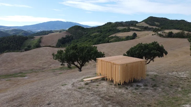 Il padiglione, vincitore del Festival di Microarchitettura 2025 e prima opera del collettivo austriaco Studio Carraldo, è concepito come una struttura sonora emergente da un campo di grano, capace di trasformare l'azione del vento in vibrazione e movimento. L'intervento adotta un approccio essenziale e sostenibile: tutti gli elementi sono ricavati dalle sezioni di legno fornite dall'organizzazione, riducendo al minimo scarti e consumo di materiale.