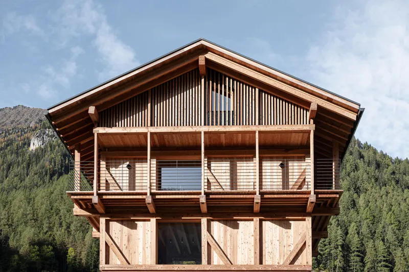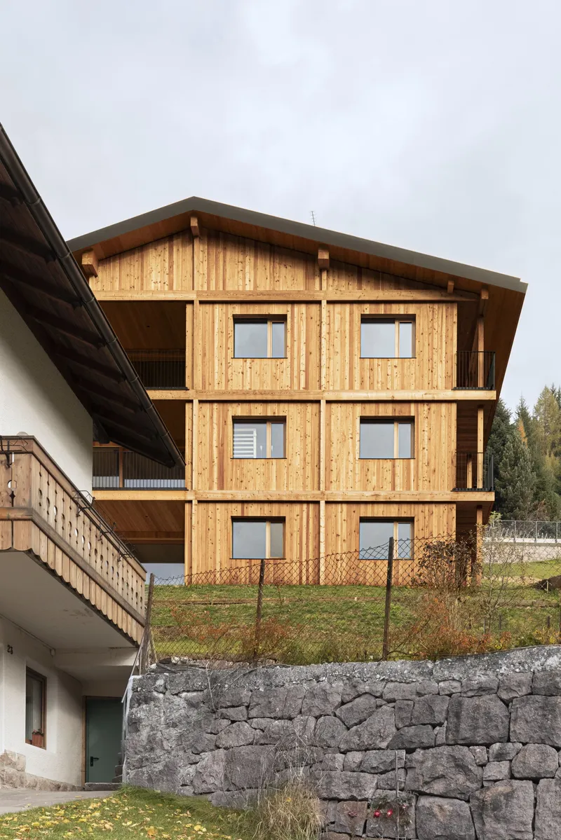 A 1.300 m in Val Gardena, lo studio Mahlknecht Comploi realizza un'abitazione completamente in legno proveniente dal bosco di proprietà, priva di collanti e senza impianto di riscaldamento tradizionale.