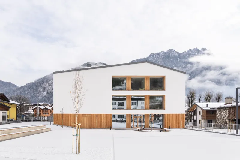 Il programma funzionale si sviluppa su tre piani, organizzati intorno a un grande vuoto centrale illuminato dall'alto, che distribuisce gli ambienti didattici. L'architettura essenziale si caratterizza per facciate lineari, ampie vetrate e basamento in larice locale, in dialogo con gli spazi esterni e il paesaggio alpino.