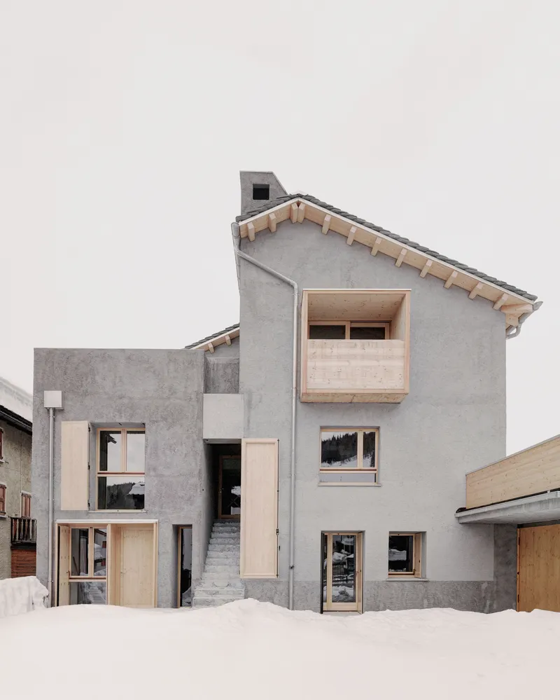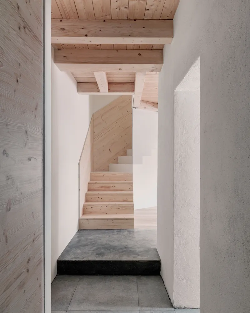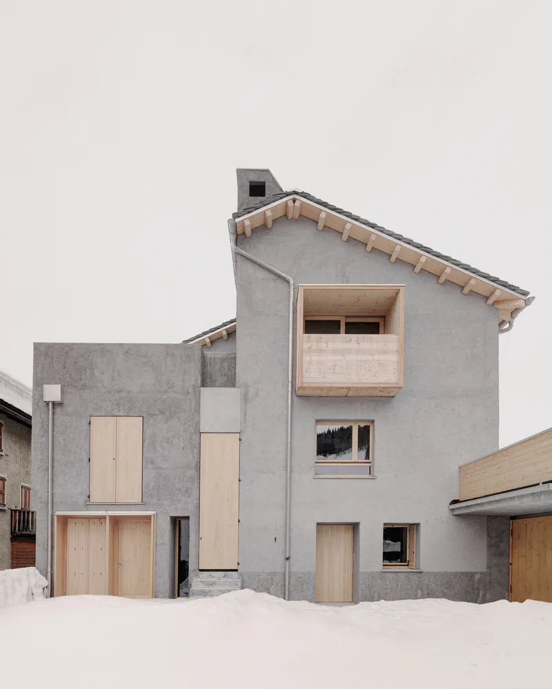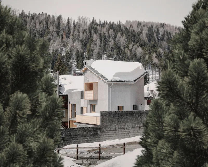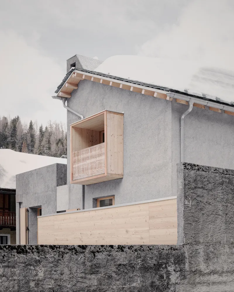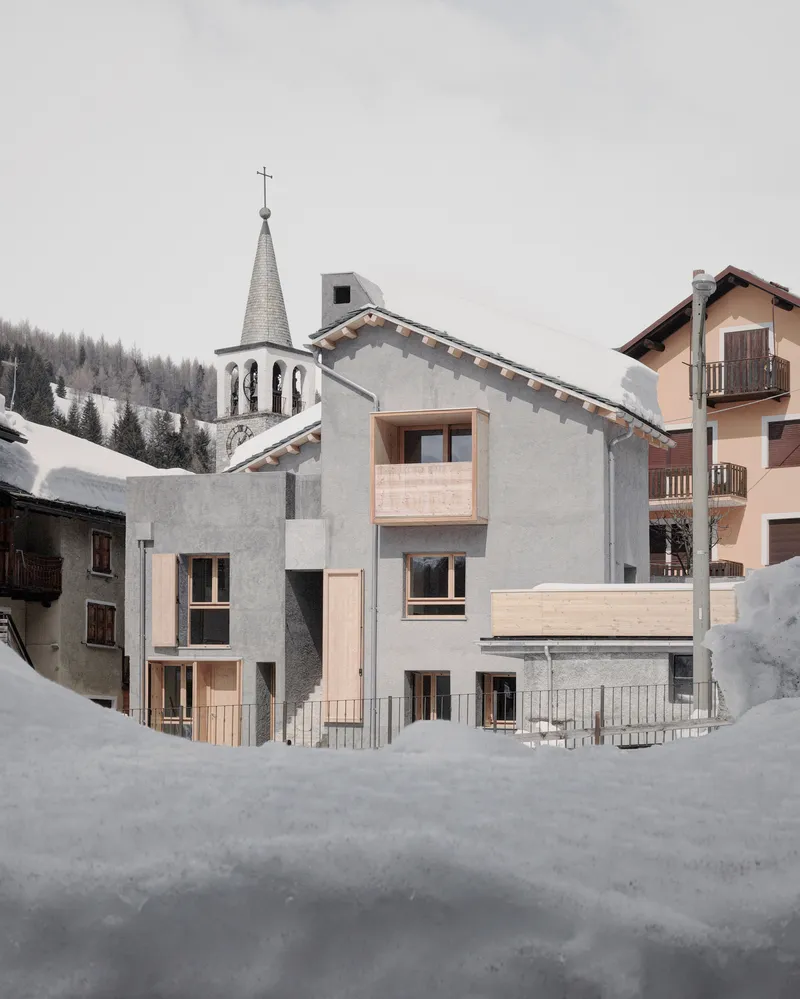 Anche la scelta delle finiture, con le pareti in intonaco rustico, è da ricondurre alla volontà di non rendere troppo evidente il distacco tra i due corpi di fabbrica. Gli elementi in legno, invece, utilizzati in modo puntuale, introducono una differenziazione materica nell'insieme e, entrando in contrasto materico e cromatico con l'intonaco e con il manto nevoso, evocano chiari richiami all'architettura alpina tradizionale, reinterpretati in chiave contemporanea.