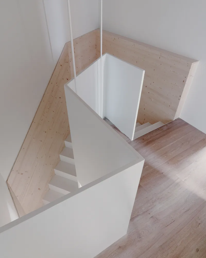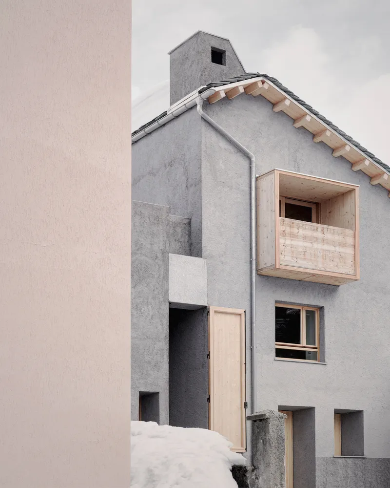 Balconi e aperture incassate definiscono spazi di transizione tra interno ed esterno, offrendo superfici protette e contribuendo al controllo climatico. Il camino presente in facciata viene spostato e la gronda mantiene la sua sporgenza, lasciando invariato il disegno della copertura originaria. Sulla casa alta, la geometria della facciata ricalca fedelmente quella originale, mentre vengono riviste le dimensioni e gli allineamenti delle finestre.