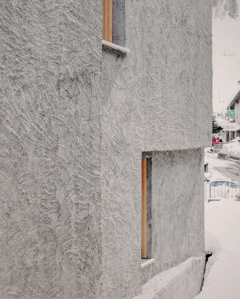 Durante l'inverno, l'edificio diventa tutt'uno con lo scenario delle montagne, emergendo dal paesaggio senza elementi di dominanza. La copertura nevosa contribuisce a rendere leggibile la geometria compositiva, evidenziando la chiarezza dei volumi e la loro organizzazione formale. Depositandosi sulle falde del tetto, la neve ne segue le pendenze, mettendo in risalto aggetti, discontinuità e variazioni volumetriche e riconoscendo a ogni elemento costruttivo il suo ruolo, chiaramente leggibile, senza fronzoli e ridondanze formali.