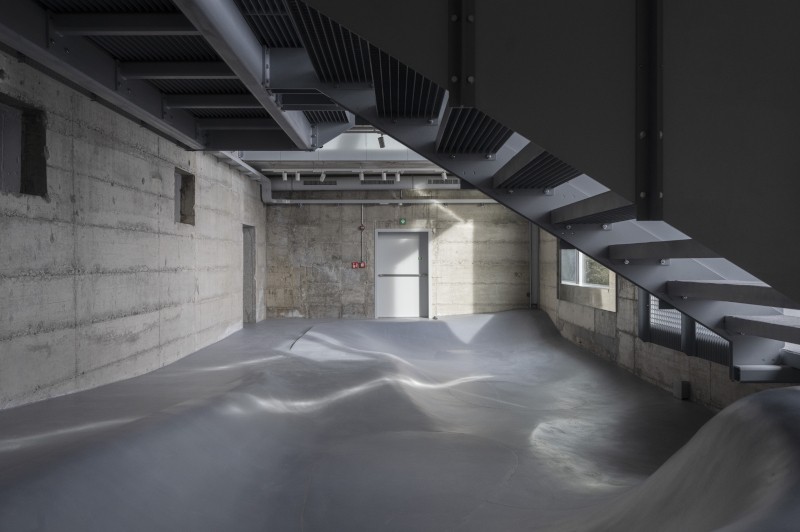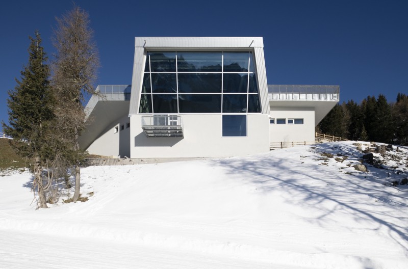 L'area sottostante il vecchio accesso alle cabine è stata trasformata in un punto panoramico, dove una superficie flessuosa, modellata con i detriti delle demolizioni, conduce il visitatore verso una piattaforma protesa sul paesaggio. Il percorso ascendente culmina nella sala principale, dominata da una grande facciata inclinata che ricalca l'originaria struttura in acciaio della stazione e incornicia le montagne. Da qui, l'itinerario prosegue attraverso le vecchie officine e i magazzini, fino a una piccola sala cinematografica, pensata anche per conferenze, prima di riconnettersi con il foyer attraversando gli spazi tecnici, ora parte integrante dell'esperienza.