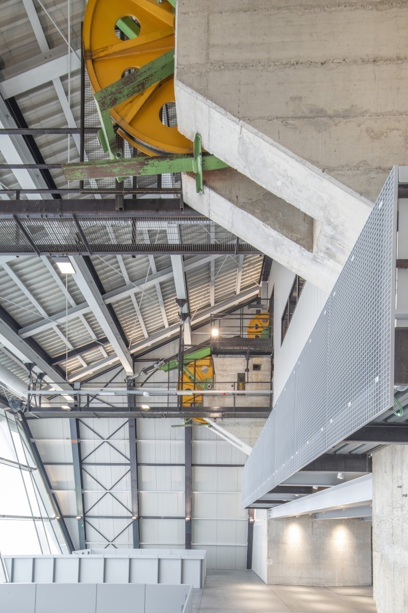 All'interno, il percorso di visita alterna spazi di meditazione e panorami spettacolari. L'ingresso allo spazio espositivo avviene attraverso un varco scavato nel cemento, che consente al visitatore di penetrare questa nuova orografia e accedere al foyer sottostante. Da qui inizia il percorso, che attraversa l'imponente vano dei contrappesi, alto 17 metri, oggi riconvertito in spazio di collegamento verticale. Elementi meccanici vivacemente colorati - pulegge, cavi, ingranaggi - ora immobili, conservano la memoria e contribuiscono a restituire la percezione di un tempo sospeso. Il visitatore discende, immerso nell'estetica grezza e materica della costruzione originaria, fino ai vecchi magazzini, per poi risalire verso uno spazio luminoso, dove si apre una vista spettacolare sulle Dolomiti.