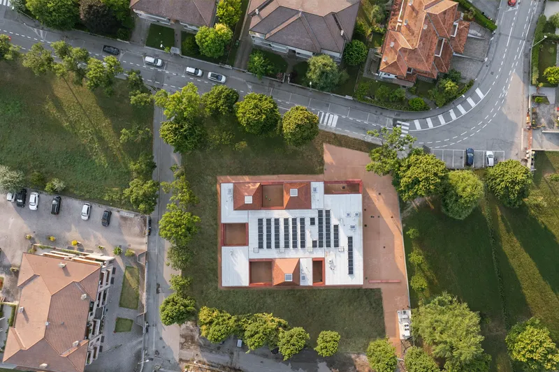 La luce scivola sul soffitto in legno, mettendone in risalto la texture che, come una meridiana, fa percepire il passare del tempo. A terra, infine, la panca in calcestruzzo pigmentato corre lungo il perimetro e definisce il rapporto con il suolo. È basamento e seduta allo stesso tempo: disegna l'attacco dell'edificio, accompagna il bordo tra interno ed esterno e offre un piano continuo su cui sostare, aspettare, giocare.