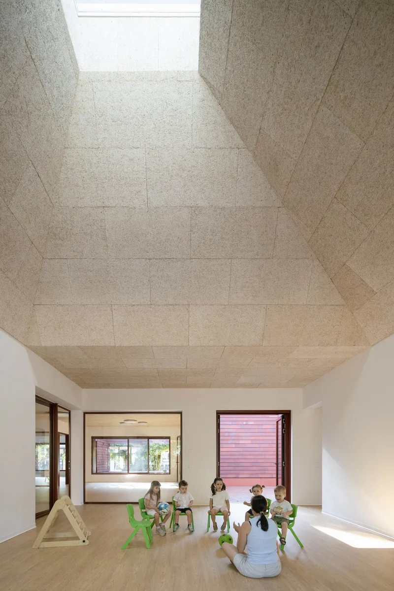 L'anima di Kinder Rain si legge soprattutto in sezione. Le coperture piramidali non coincidono con il perimetro delle aule, ma arretrano rispetto agli ingressi e lasciano che lo spazio centrale si estenda, mettendo in continuità agorà e ambienti didattici. L'ingresso degli spazi educativi è più basso e raccolto, mentre all'interno l'altezza si dilata seguendo l'inclinazione delle falde, fino ad aprirsi verso l'alto. In quel punto di massima altezza, l'apertura quadrangolare e i lucernai zenitali portano la luce dall'alto, evidenziando la qualità degli ambienti.