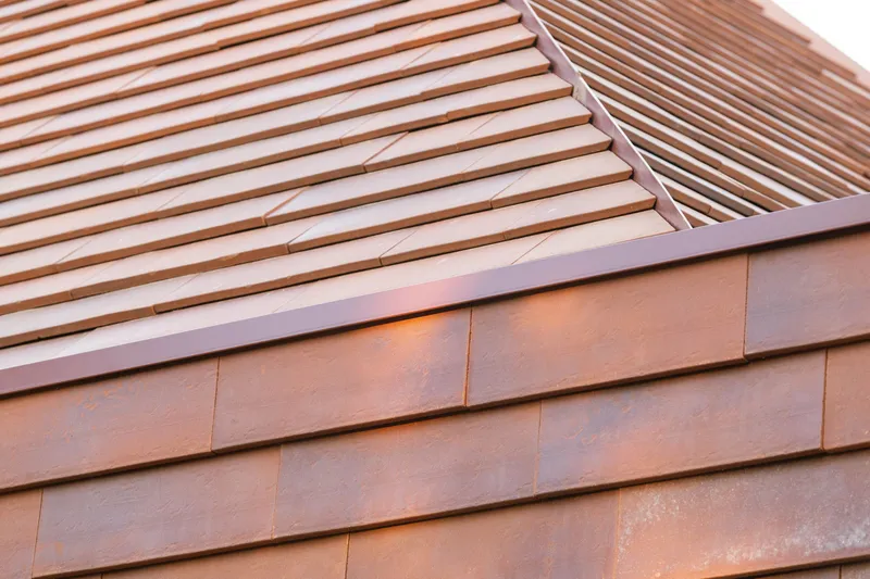 Dall'esterno, l'edificio appare come un fronte unitario, scandito dalla sequenza delle coperture piramidali che emergono sopra una linea continua di facciata. Da vicino, quell'unità si scompone: il volume si articola in tre aule, riconoscibili come eccezioni plastiche all'interno di un continuum materico in terracotta con scandole di colore vermiglio.