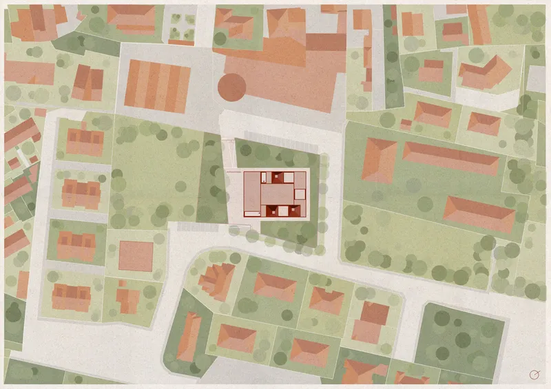 Il richiamo al vernacolare trova riscontro anche nella scelta dei materiali: il laterizio, declinato nella sua cromia vermiglia, recupera la secolare tradizione costruttiva locale del coppo e diventa elemento identitario dell'intero complesso. Il colore caldo dell'involucro, al tempo stesso, dialoga con il verde circostante, conferendo all'edificio un carattere accogliente e rassicurante, quasi domestico.