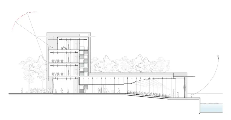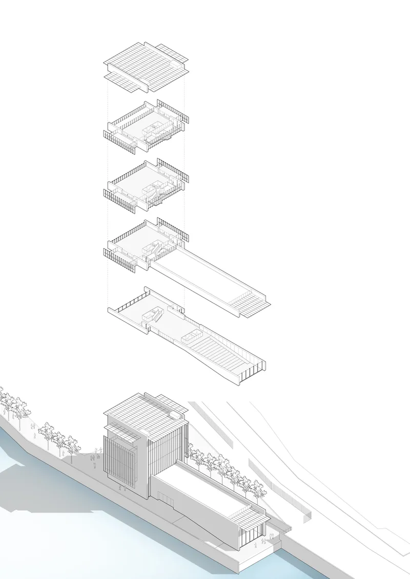 L'edificio nasce come uno spazio aperto e permeabile, pensato per dialogare costantemente con la città e il paesaggio che lo circonda. Da ogni lato si aprono viste precise: il Mausoleo di Teodorico a nord, il centro storico a ovest, la Darsena a sud e il mare a est, trasformando il contesto in parte integrante del progetto e facendo leggere l'architettura come una composizione di piani e superfici opache e trasparenti che seguono l'andamento del sito e ne riflettono le direzioni.