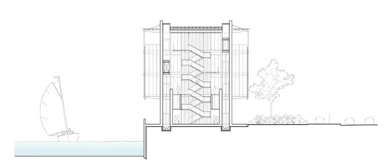 Reinterpretando i principi dell'architettura romanica in chiave contemporanea, infatti, la nuova struttura richiama alla memoria le torri di avvistamento tipiche dei contesti portuali, ristabilendo un dialogo profondo non solo con l'ambiente marittimo, ma anche con la città circostante. L'uso del rivestimento in laterizio assicura la continuità materica e cromatica con gli edifici più storici del centro, affidando alla nuova struttura lo status di nuovo simbolo di Ravenna, elemento di congiunzione tra storia, memoria e innovazione, riconoscibile sia dalla terra che dall'acqua.