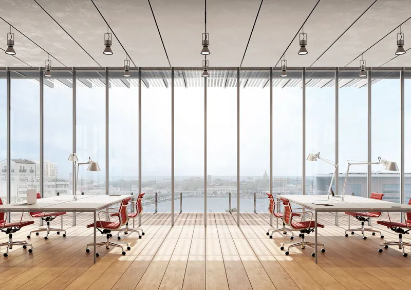 I piani trasparenti, in corrispondenza degli uffici, sono studiati per ottimizzare il controllo del microclima e della luminosità degli ambienti. La facciata è costituita da un sistema di doppie lastre di vetro laminato (690x4500 mm), incorniciate da montanti verticali in alluminio rinforzato e da traversi orizzontali.Tra le due lastre di vetro, una camera d'aria funge da isolante termico e acustico, migliorando l'efficienza energetica dell'edificio.