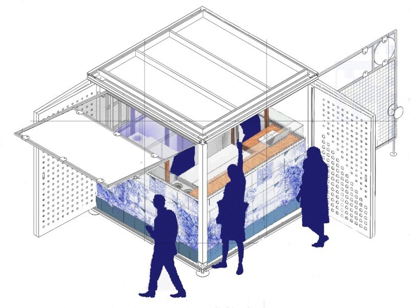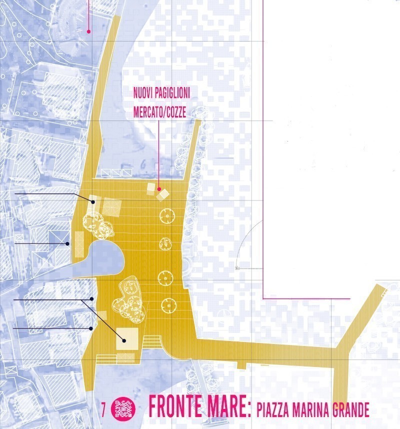 La piazza affacciata sul mare (piazza Marina Grande), luogo strategico di connessione tra città, mare e area archeologica, viene riconfigurata in un'ottica di maggiore armonia, permeabilità e apertura verso il golfo di Napoli, facilitando l'accesso alla spiaggia e alla Tomba di Agrippina. Spostando i parcheggi, la piazza si dilata e nuovi padiglioni leggeri, mobili e modulari, accolgono la vendita e il consumo sul posto di mitili e pesce fresco a km0. I padiglioni, in biomateriali innovativi derivati da scarti di mitili e utilizzabili anche per il noleggio imbarcazioni sul fronte lago, sono facilmente adattabili ad ulteriori funzioni.