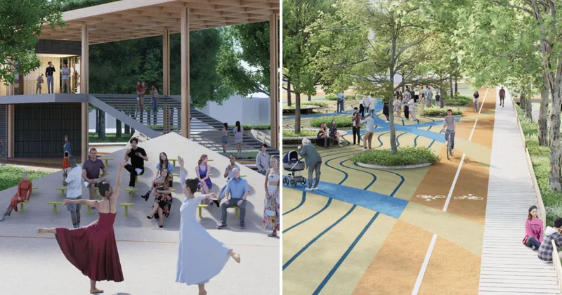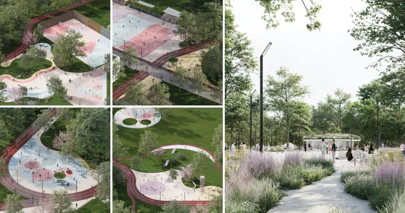 Una rete continua di percorsi definisce l'impianto del progetto: una pista anulare, affiancata da promenade pedonali, connette campi sportivi, aree attrezzate e spazi collettivi in un sistema unitario e accessibile. Pensata per corridori, ciclisti e pedoni, l'infrastruttura garantisce continuità con la città e favorisce l'uso quotidiano del parco.