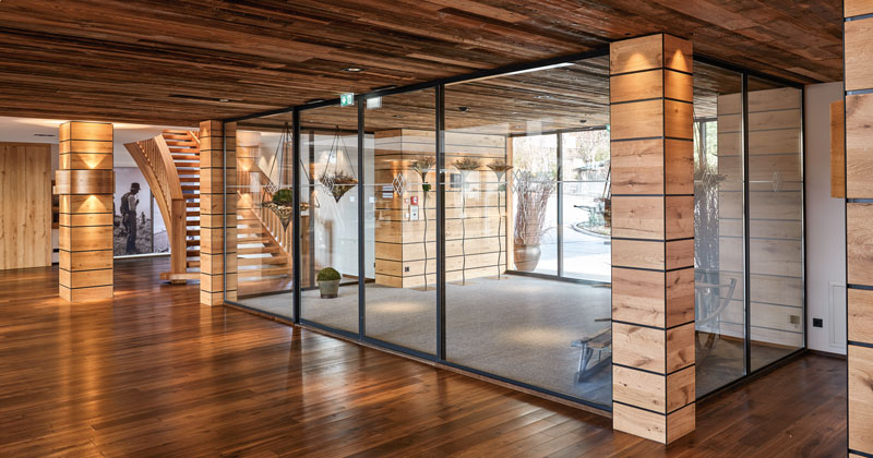 Anche le uscite di sicurezza sono state scelte ad hoc per integrarsi al meglio con l’ambiente di questo hotel caldo, dominato dall’uso del legno: porte antipanico e chiudiporta TS 93 con guida di scorrimento, dove il passaggio è facilitato grazie ad un momento di apertura molto basso.