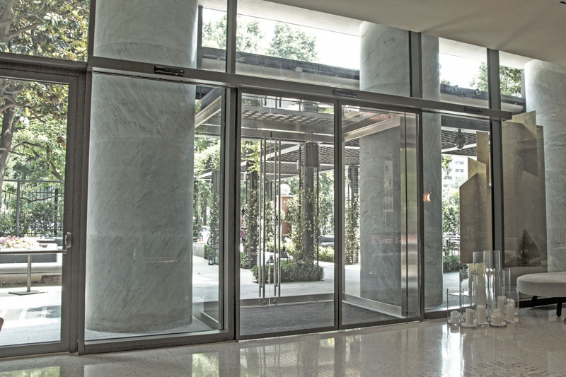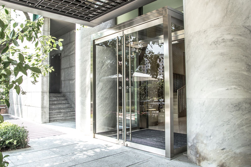 Nella parte interna l’accesso alla lobby è automatizzato da un porta scorrevole ST Flex a due ante con profili a sezione ridotta. Anche gli ingressi dell’area ristorante e fitness sono gestiti da porte a battente con apertura manuale che dialogano con il design dell’ingresso e dell’intero progetto di interior design.