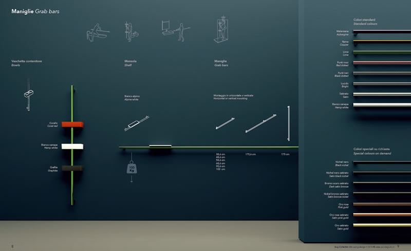 A livello cromatico i tre colori dei mobili (Cartazucchero, Seta e Bianco Puro) e quelli delle sedute (Grafite, Bianco segnale e Corallo) si possono abbinare con numerosi colori e finiture previsti per le maniglie di sicurezza che, sono disponibili con le finiture chiamate Rame, Lime e Melanzana ottenute con innovative verniciature colorate trasparenti che lasciano a vista i riflessi dell’acciaio.
