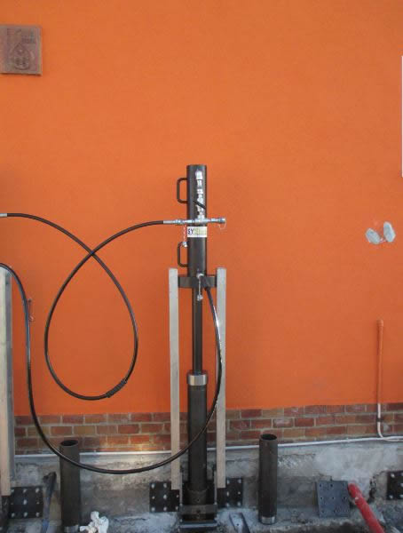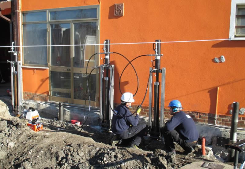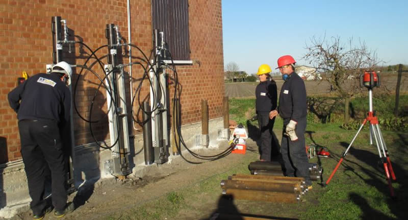 L’installazione dei pali è avvenuta con l’ausilio di martinetti idraulici solidarizzati alla fondazione dell’edificio mediante apposite piastre in acciaio dedicate, che si ancorano saldamente alla fondazione mediante tassellatura. La fondazione dell’edificio e la sovrastante struttura realizzano, di fatto, la struttura di contrasto che consente l’infissione in profondità della batteria di elementi fino al raggiungimento dell’orizzonte solido.
