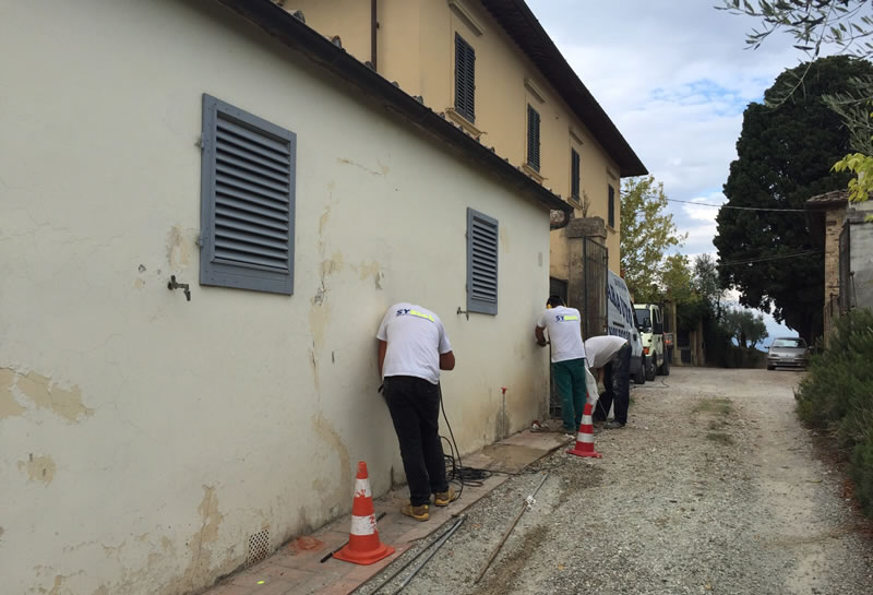 Recentemente è stato eseguito il consolidamento di una abitazione civile sita in provincia di Firenze, sulle colline di Impruneta. Il fabbricato presentava cedimenti differenziali estesi a tutta una porzione della struttura, verosimilmente causati dalle infiltrazioni di acqua provenienti da una vecchia cisterna di raccolta delle acque piovane sita nella porzione più a monte della casa.