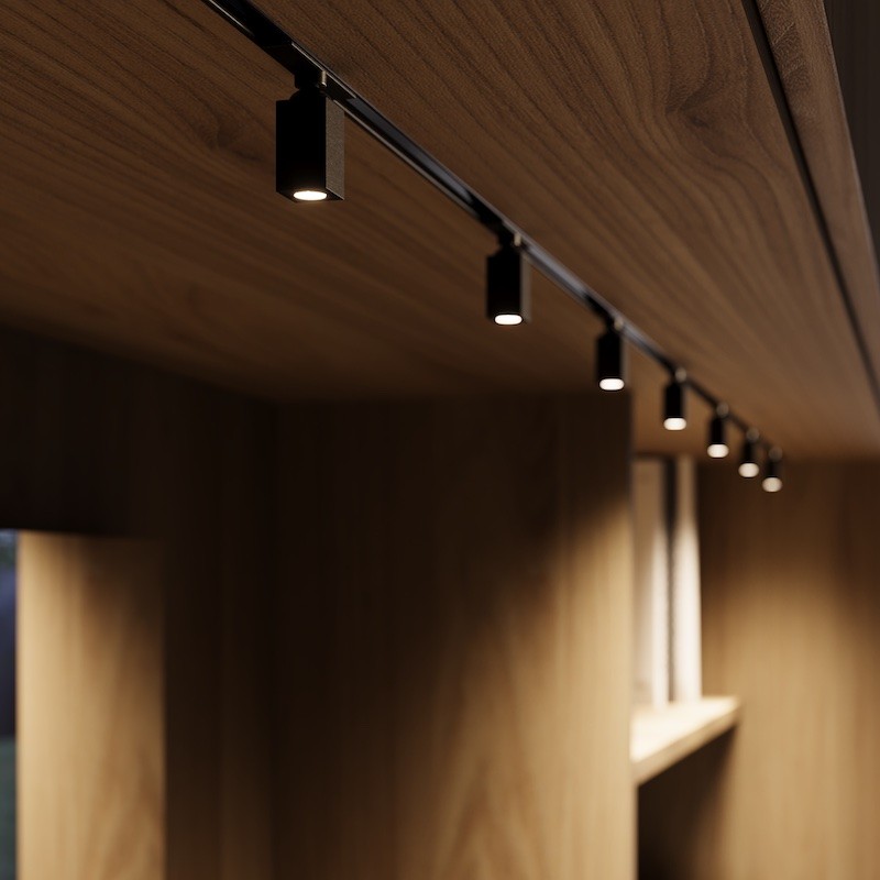 All’interno, due piste elettrificate permettono di alimentare i corpi illuminanti in qualsiasi punto del binario. Il risultato è una struttura lineare, essenziale e funzionale, che libera da vincoli di posizionamento e offre libertà compositiva.