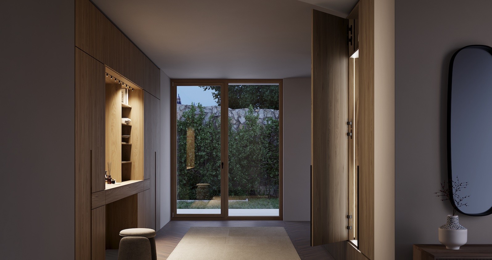 Alla base del sistema si trova un profilo in alluminio estruso, disponibile a incasso (anche in fresata passante) oppure in superficie. La sua presenza è discreta, quasi invisibile, e proprio per questo si integra con naturalezza nei mobili e negli ambienti.