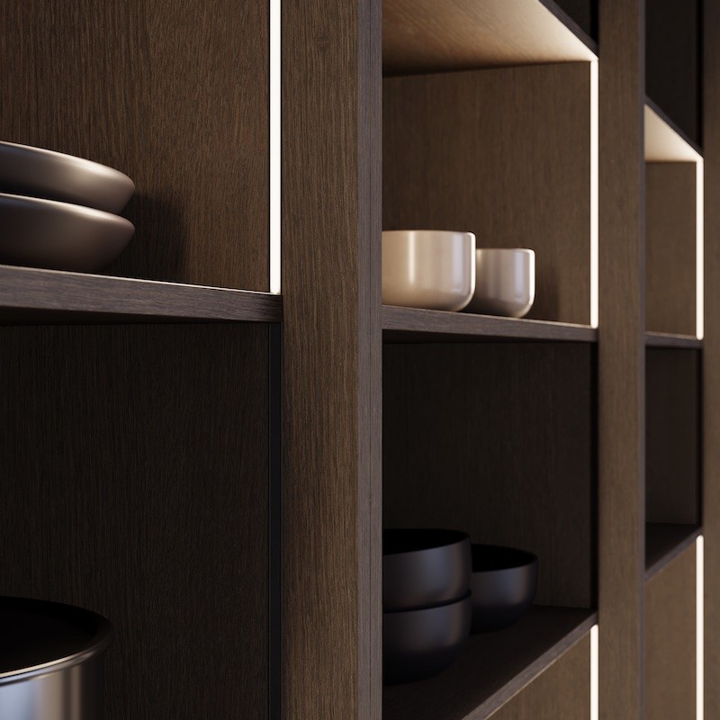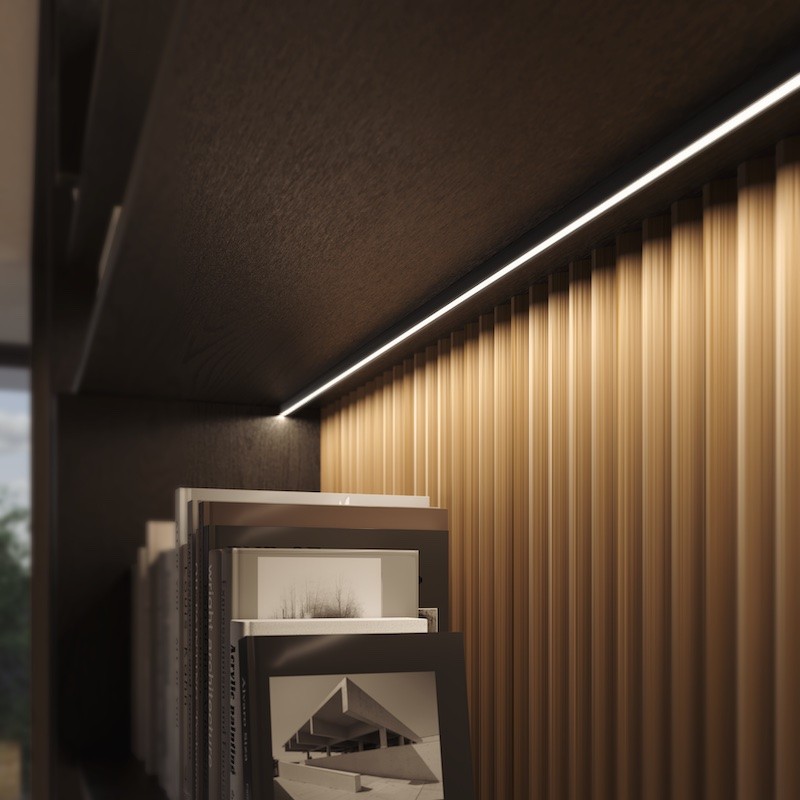 Il valore di MAGY si rivela anche nelle diverse possibilità di applicazione. In cucina accompagna il piano di lavoro, in una libreria illumina i ripiani, in una cabina armadio offre un supporto funzionale, mentre nel retail mette in risalto prodotti e allestimenti. La possibilità di combinare parti attive e schermi di copertura assicura continuità estetica, preservando l’armonia complessiva dell’arredo.
