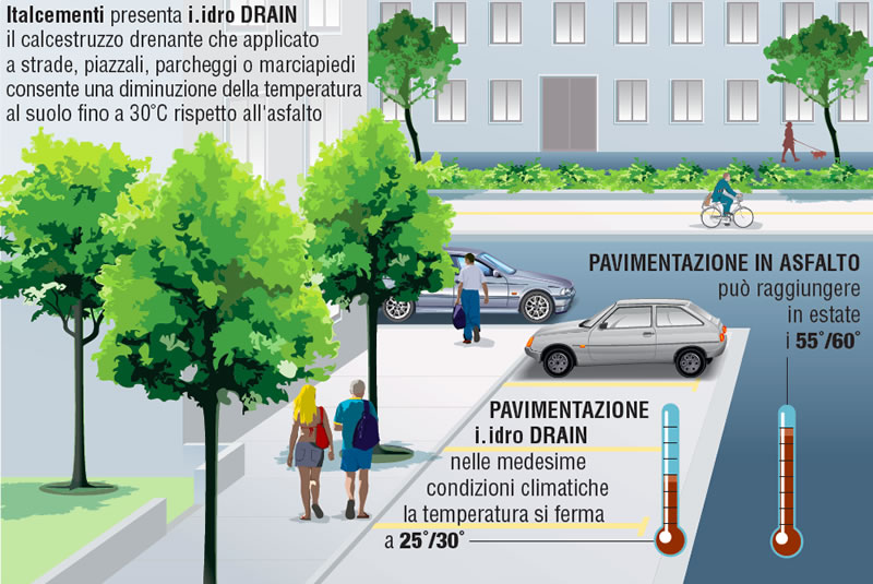 Un altro aspetto chiave del prodotto è la capacità di ridurre l’effetto “isola di calore”. La pavimentazione chiara di i.idro DRAIN riesce in condizioni di insolazione diretta nel periodo estivo, ad abbassare anche di 30°C la temperatura superficiale rispetto a una pavimentazione in asfalto.